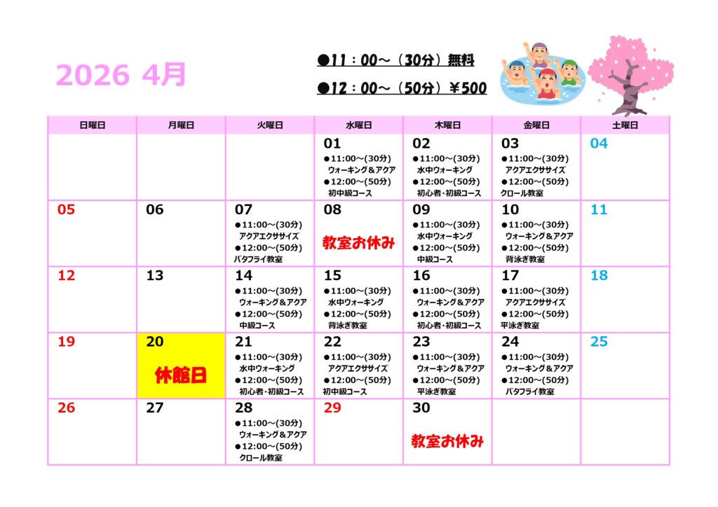 大人向け水泳教室カレンダー4月(PDF)はこちら→