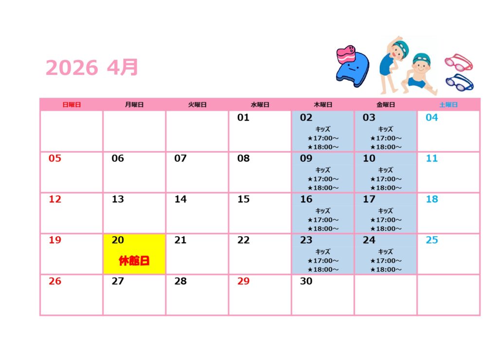 小学生向け水泳教室カレンダー4月(PDF)はこちら→